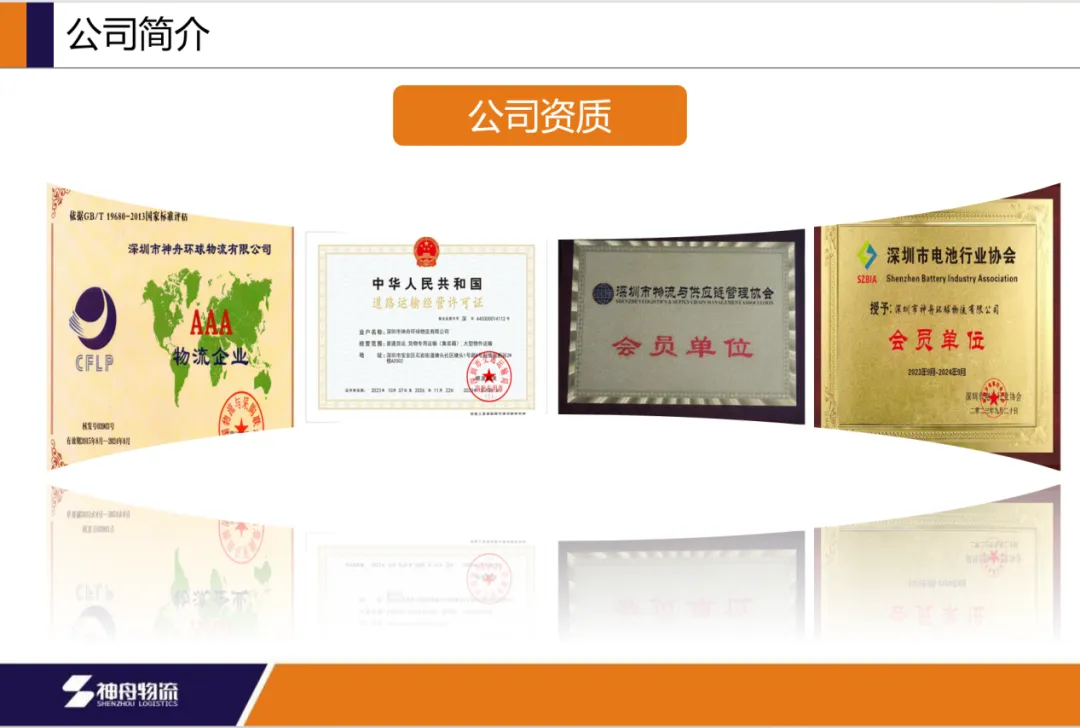深圳市神舟环球物流有限公司(简称神舟物流), 成立于二OO六年,是一家经营国内仓储运输、国际海运、空运和陆运代理服务以及供应链服务的综合性物流企业,拥有大型物件道路运输经营许可证、无船承运人等资质。神舟物流是中国物流与采购联合会AAA级物流企业、中国商务部评定AAA级信用企业、深圳市物流与供应链管理协会会员单位、深圳市电池行业协会会员单位。公司拥有18年的专业物流经验和大量的专业服务人才队伍,公司与理士国际、拓日新能、徳赛、永泰数能等知名企业建立了良好的合作关系,神舟物流愿为新能源行业企业用户提供专业的国内、国际全链条综合物流解决方案,并致力成为新能源产品的全球物流专家。