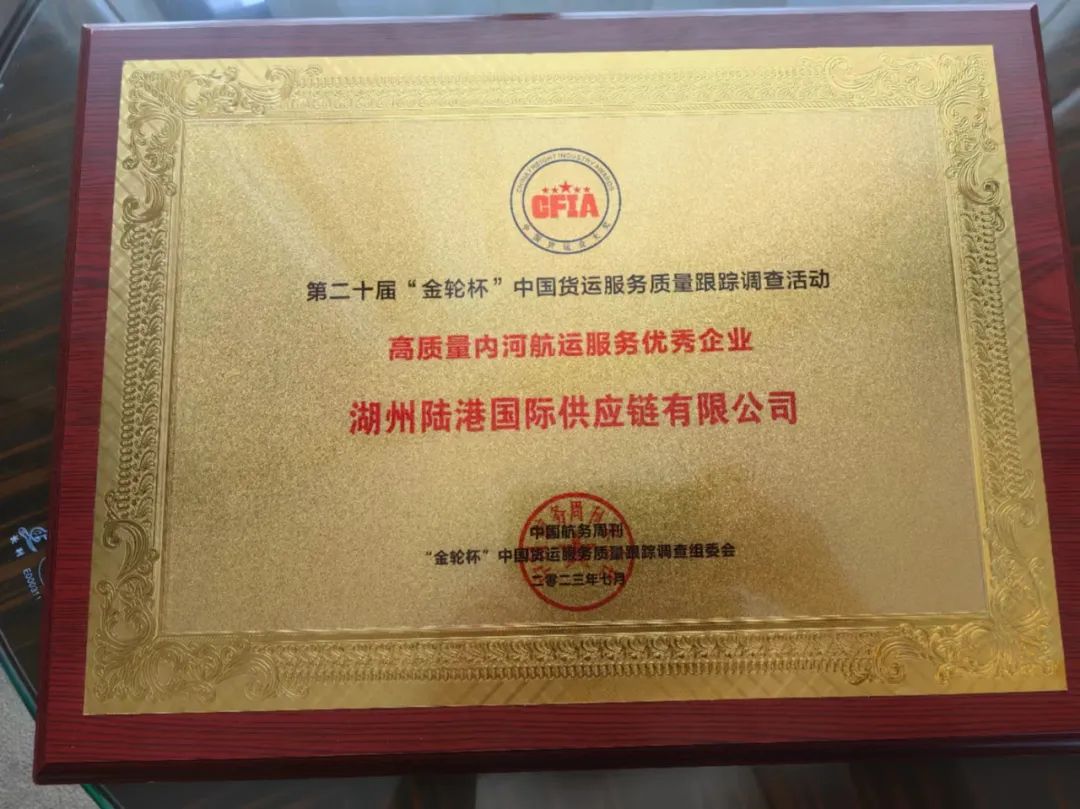 湖州陆港国际供应链荣获第二十届“金轮杯”中国货运服务质量跟踪调查活动-高质量内河航运服务优秀企业奖牌。