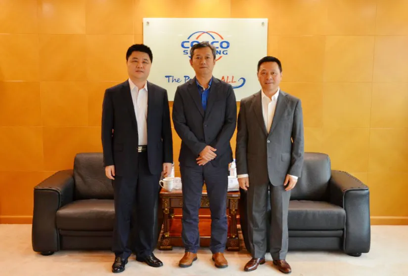 中远海运港口董事总经理朱涛(中),与中国交协航运物流分会常务副会长、中国航务周刊总编辑陈宏兵(左)、中国交通运输协会航运物流分会秘书长王修平(右)会谈后合影
