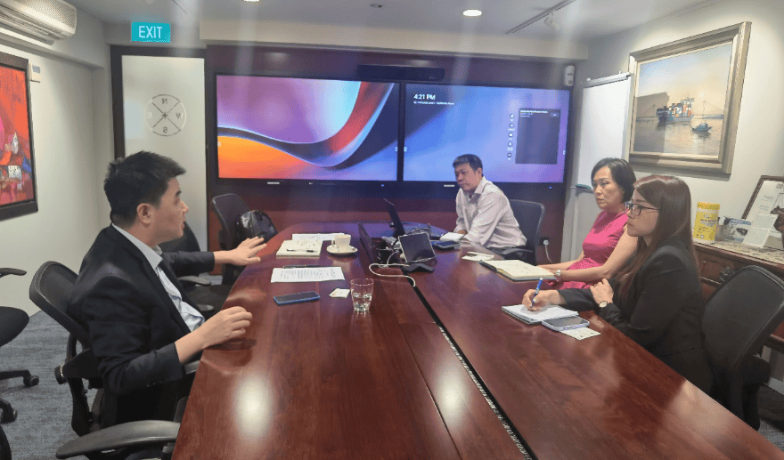 5月10日下午,代表团成员在新加坡,与X-PRESS FEEDERS首席商务官沈桂宝(Steffanie Sim)(右一)等座谈交流
