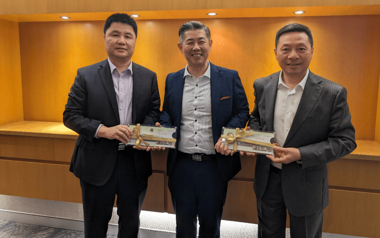 5月8日下午,代表团成员与劲升逻辑(CrimsonLogic)东北、中亚和东南亚副总裁兼大中华区总经理黄志强(中),会谈并合影