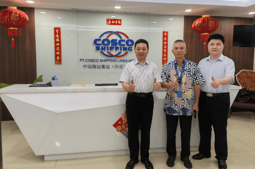5月14日上午,代表团成员与中远海运集运(印尼)公司总经理刘光辉(中)座谈后合影