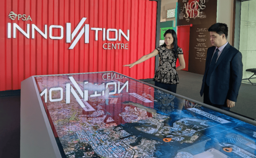 新加坡港务集团(PSA)东南亚区域企业通讯与商务总监王秋璇(左),向代表团成员介绍PSA发展情况
