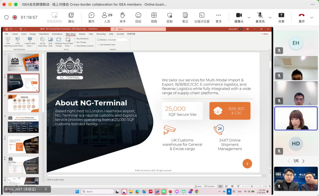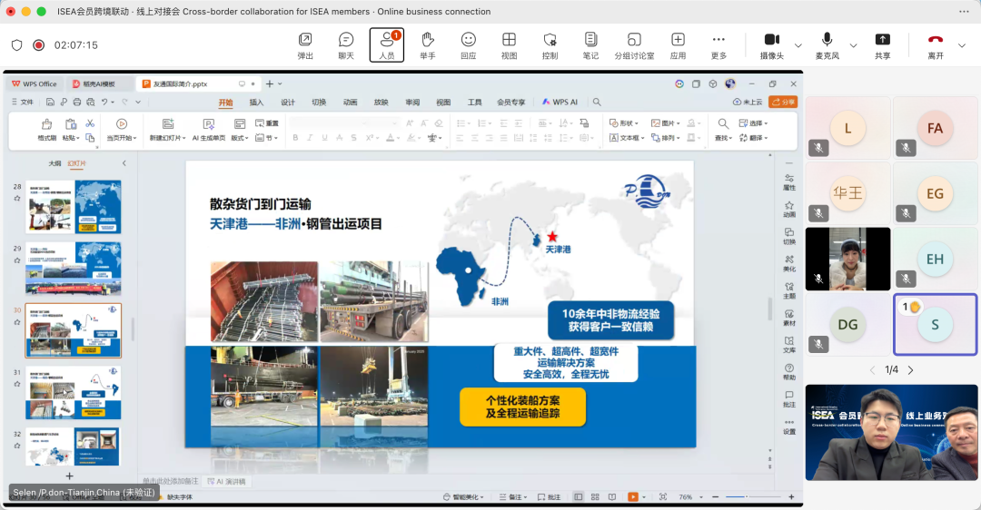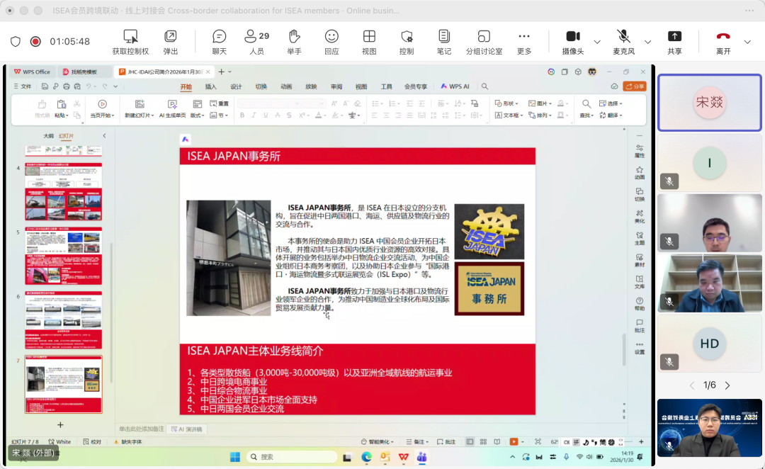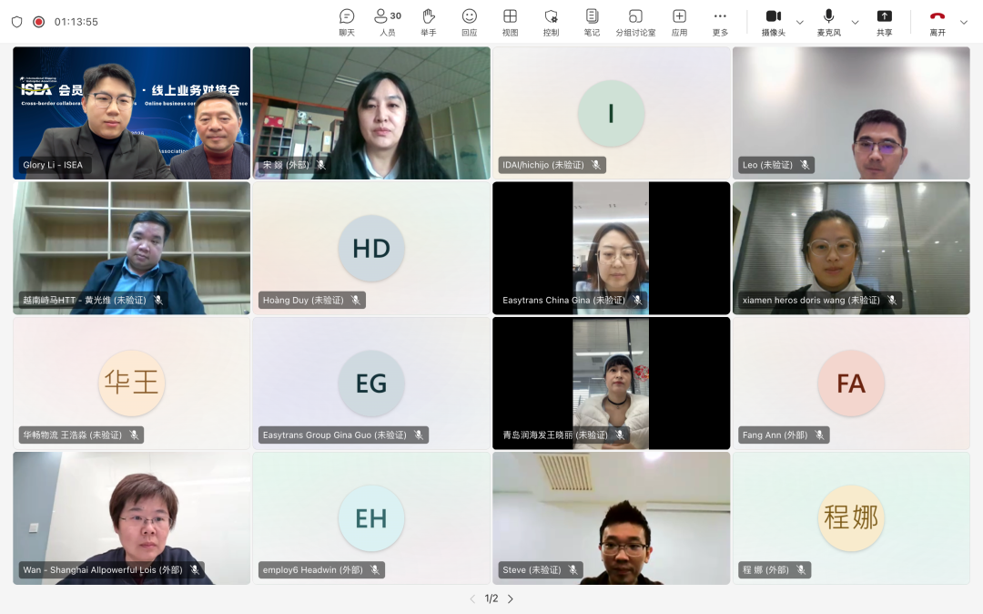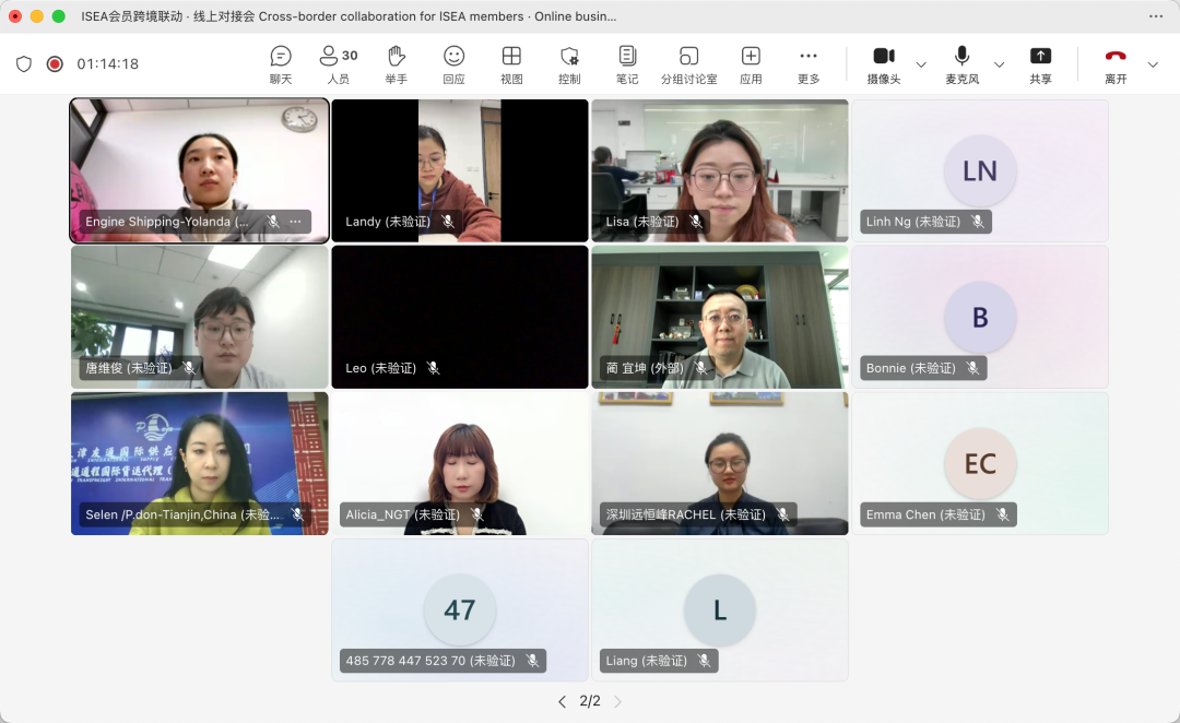 2026年1月30日,国际航贸物流平台(ISEA)成功举办“ISEA会员跨境联动・线上业务对接会”。本次活动以Microsoft Teams为线上载体,越南、马来西亚、菲律宾、泰国、日本、英国、尼日利亚7个国家的海外会员企业与大连、天津、青岛、上海、宁波、厦门、深圳7个国内重点口岸近30家优质会员企业,通过“精准对接+高效互动”的模式,搭建起跨境物流行业的云端合作桥梁。多家企业在现场达成初步合作意向,实现了跨境业务对接的高效落地。